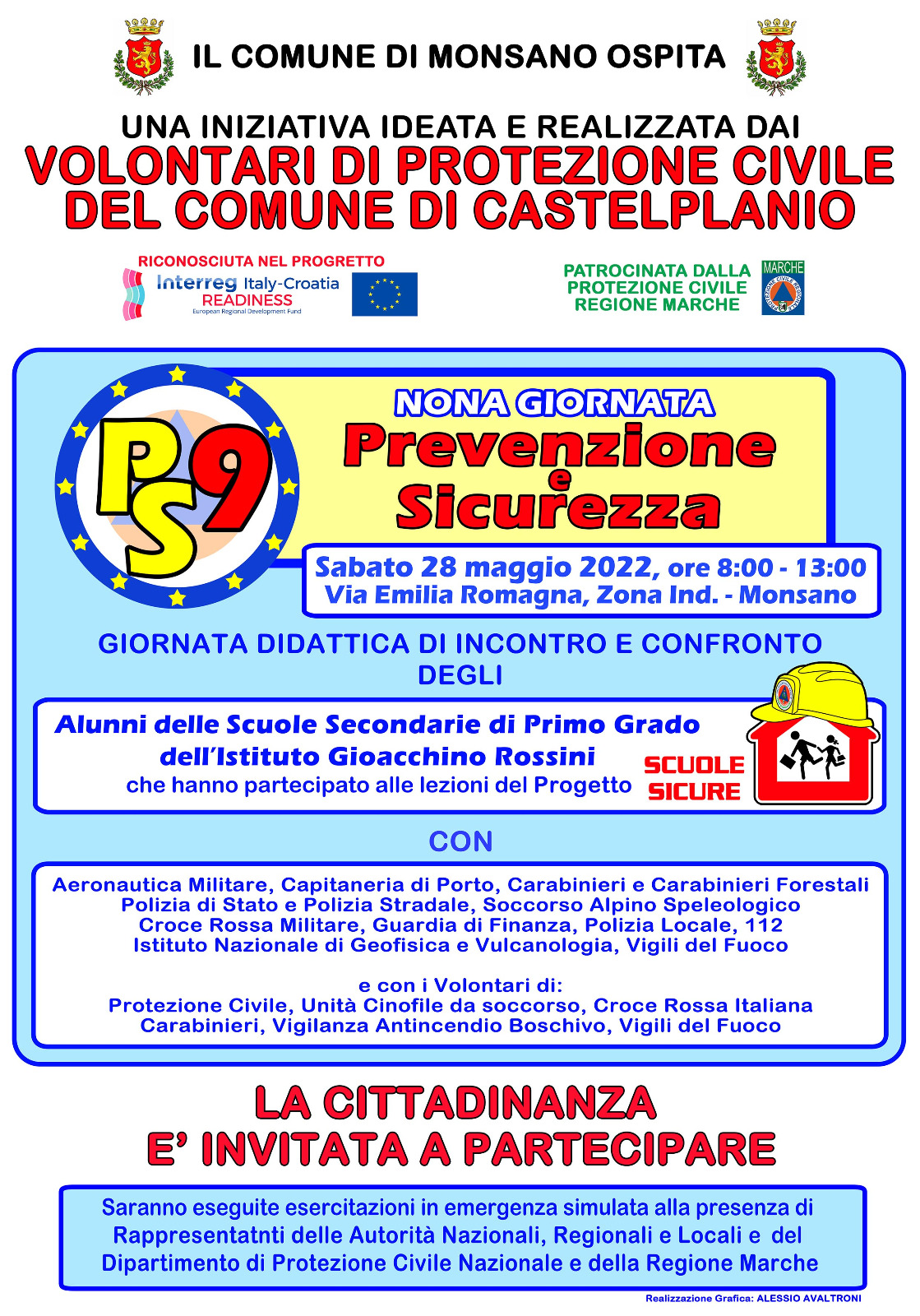 A conclusione di un percorso formativo ed educativo svolto in classe grazie alla presenza di squadre di esperti altamente specializzate, gli studenti della Scuola Secondaria di Primo Grado dell’IC ROSSINI hanno potuto formarsi in materia di PREVENZIONE E SICUREZZA. Il percorso didattico si concluderà con la giornata del 28 Maggio 2022 dalle ore 8 alle ore 13. Per i dettagli della manifestazione si rinvia alla locandina. All’evento saranno presenti i rappresentanti delle Autorità nazionali, locali e regionali. Si ringraziano i volontari della Protezione Civile del Comune di Castelplanio e tutti coloro che collaborano per la formazione e l’organizzazione dell’evento.